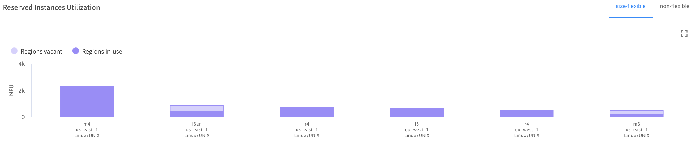 • Flexible RIs: This graph provides insight into your NFU utilization per region. (NFUs are normalized factor units, available CPUs based on the AWS instance size flexibility model.
